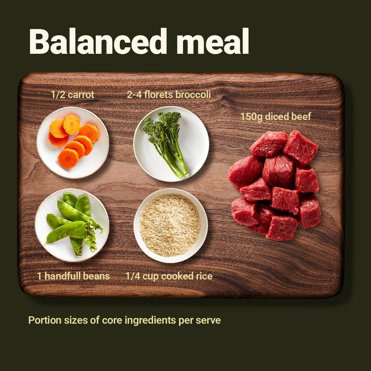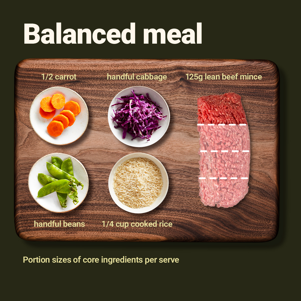 Meal ideas and tips to communicate practical information about adding a variety of 3+ vegetables and legumes to lean red meat