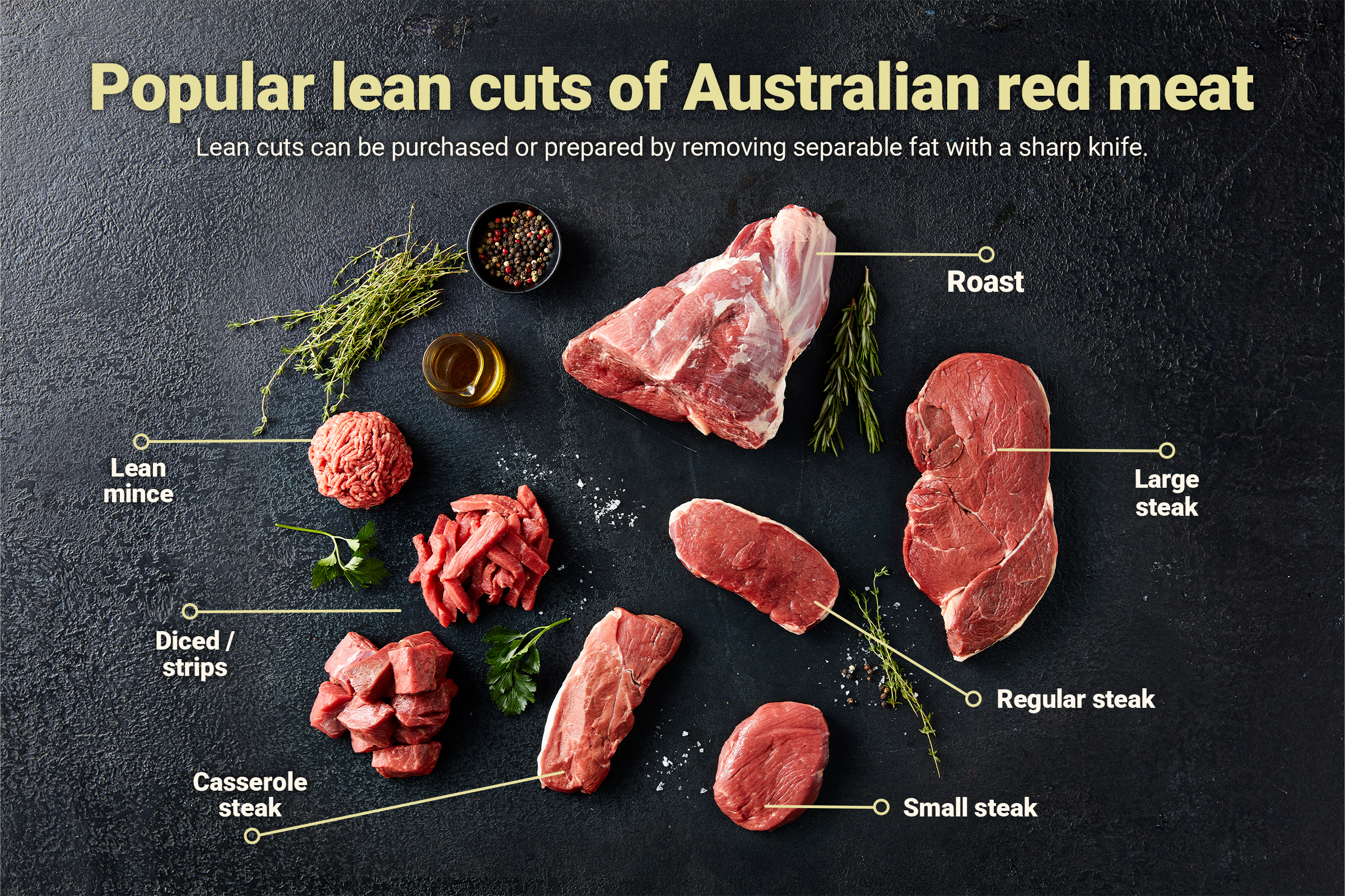 • Lean, unprocessed cuts of red meat are recommended in the Australian Dietary Guidelines, including lean mince, all cuts of Australian beef, veal, lamb, mutton and goat meat trimmed of separable fat and lean, low sodium sausages. Cuts include steak, casserole cuts, roasts, chops, diced and strips [1].